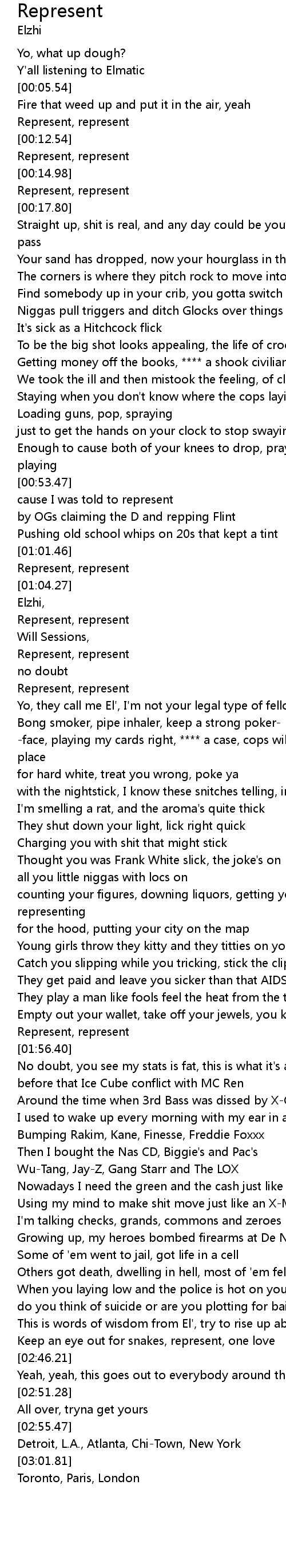 | [01:12.57] | Yo, they call me El', I'm not your legal type of fellow |