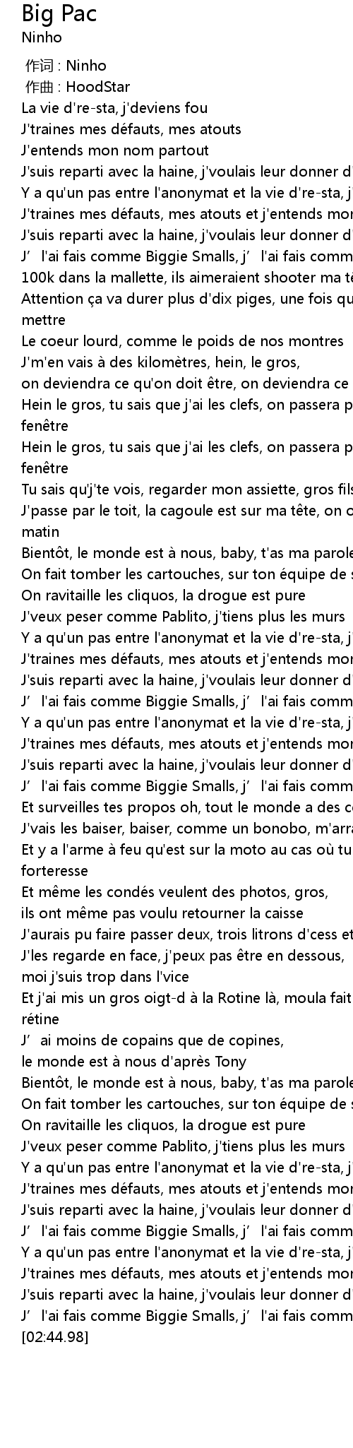 | [02:41.39] | J' l' ai fais comme Biggie Smalls, j' l' ai fais comme Tupac Shakur |