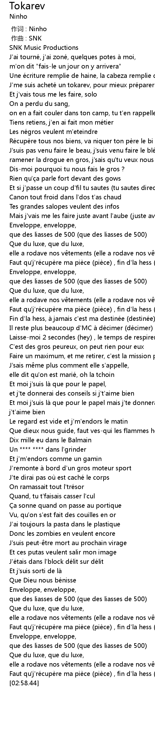 | [02:52.02] | Faut qu'j'récupère ma pièce (pièce) , fin d'la hess (hess) |