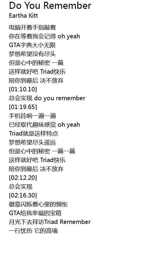 | [01:12.35] | zǒng huì shí xiàn do you remember |