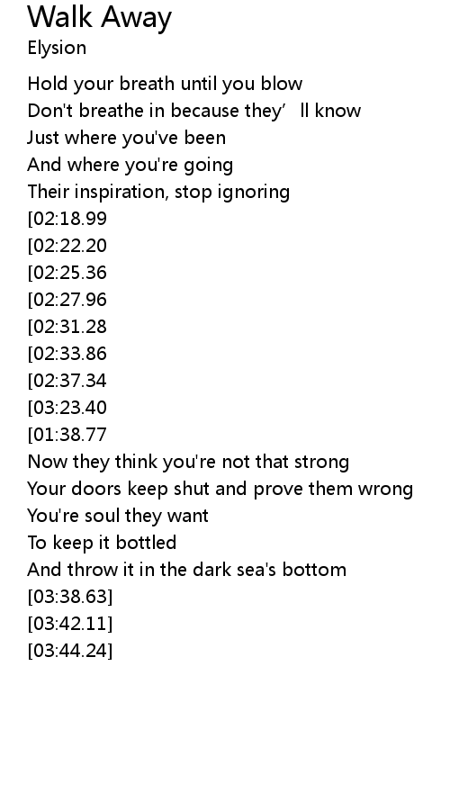 | [03:26.38][03:23.40][03:20.24][02:41.04][01:35.72] | Just walk away |