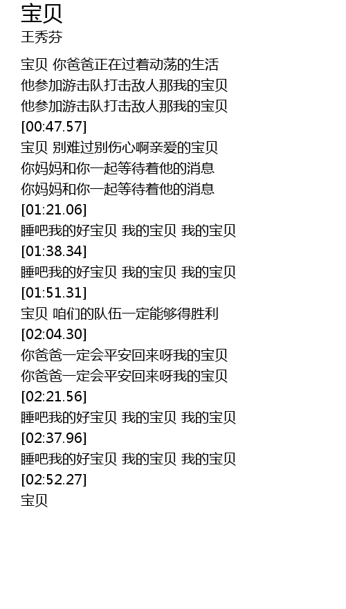 | [02:06.01] | 你爸爸一定会平安回来呀我的宝贝 |