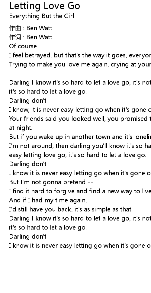 | Darling I know it' s so hard to let a love go, it' s not easy letting love go, it' s so hard to let a love go. | |