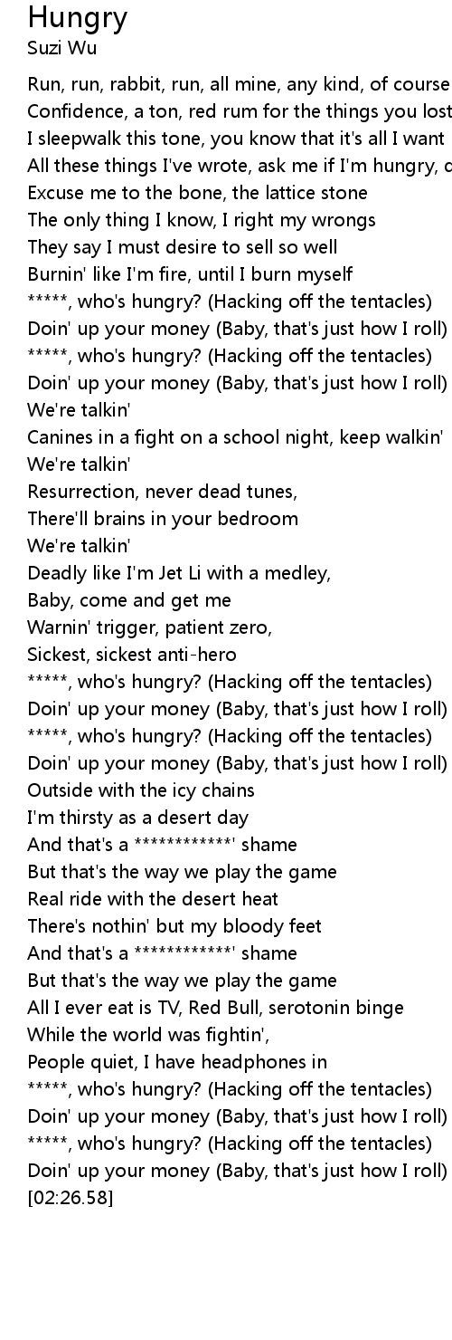 | [00:20.45] | All these things I've wrote, ask me if I'm hungry, darling |