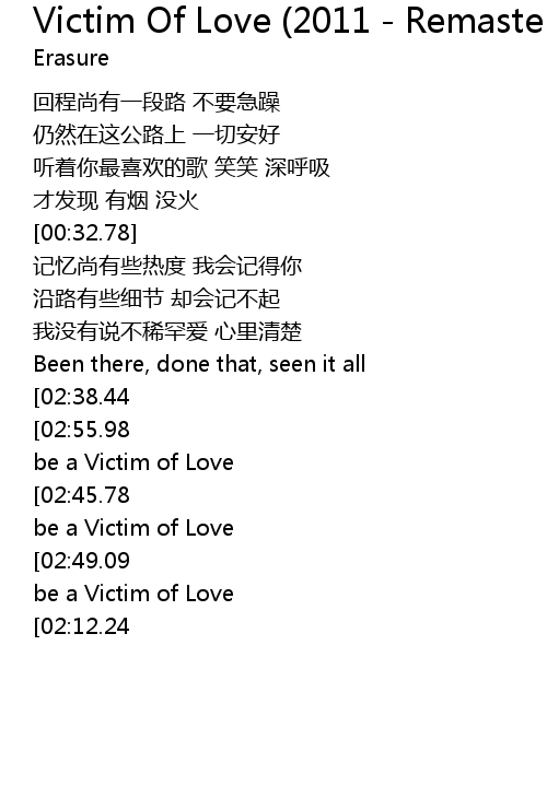 | [02:59.44][02:45.78][02:30.44][02:18.09][02:04.39][01:50.72][01:37.14][01:19.89][01:06.21] | Don' t be a Victim of Love |