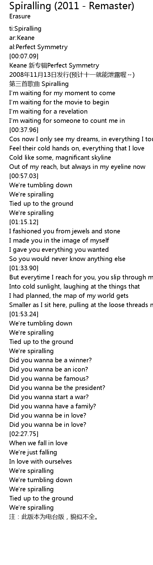| [00:00.00] | ti:Spiralling |