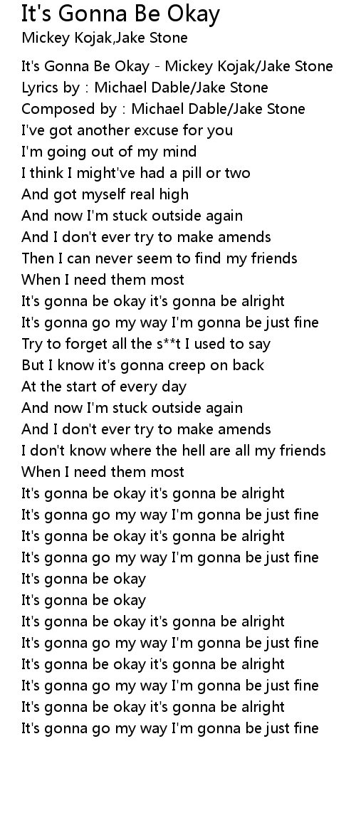 | [00:00.00] | It' s Gonna Be Okay Mickey Kojak Jake Stone |