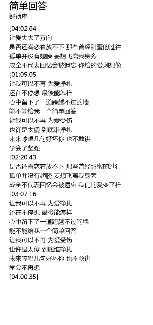 | [03:05.28][03:07.16] | 能不能给我一个简单回答 |