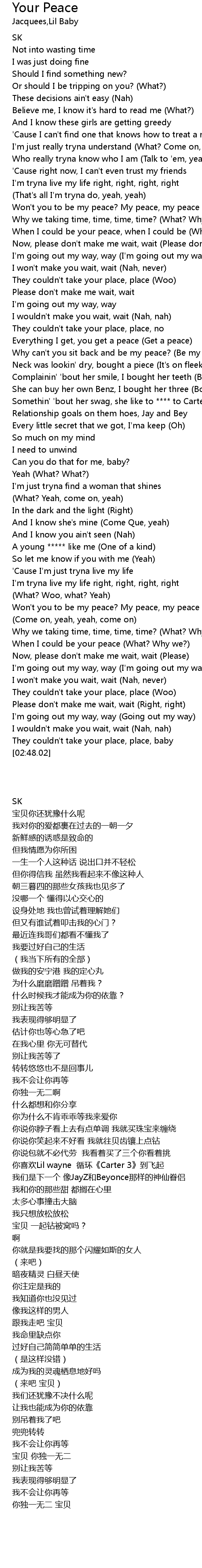 | [02:11.21] | Won't you to be my peace? My peace, my peace |