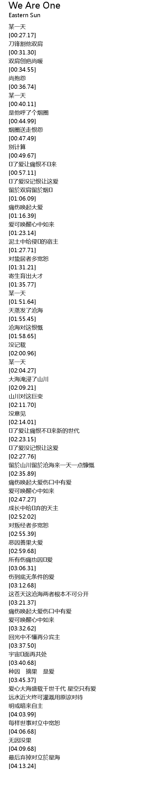 | [03:48.37] | ài xīn dà hǎi shèng zǎi qiān shì qiān dài xīng kōng zhǐ yǒu ài |