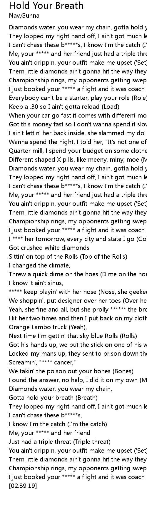 | [01:06.31] | Diamonds water, you wear my chain, gotta hold your breath (Breath) |