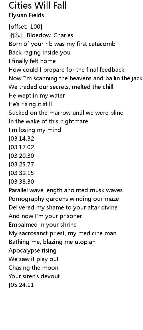 | [01:56.18][03:17.02][04:44.60][05:06.71] | Cities will fall |