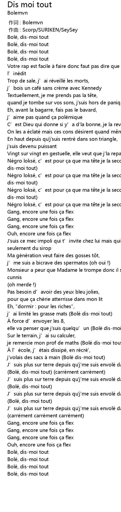 | [01:46.58] | (Bolé, dis-moi tout) (carrément carrément) |