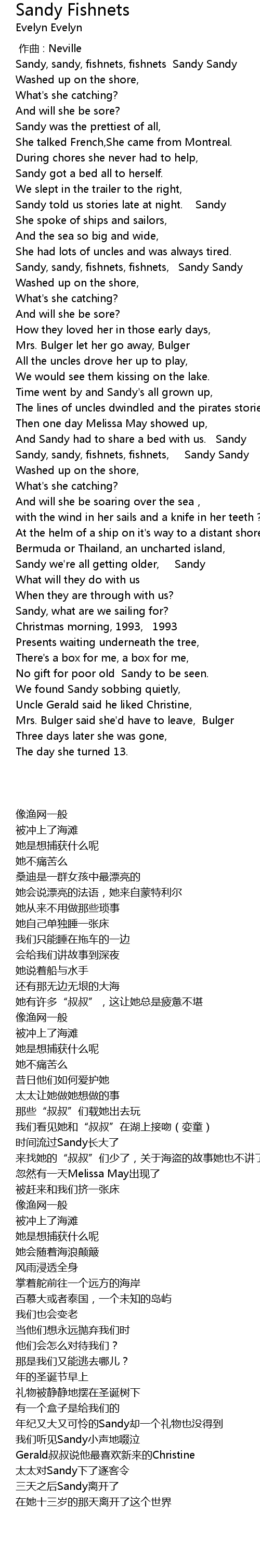| [03:49.000] | Sandy, sandy, fishnets, fishnets, Sandy Sandy |
