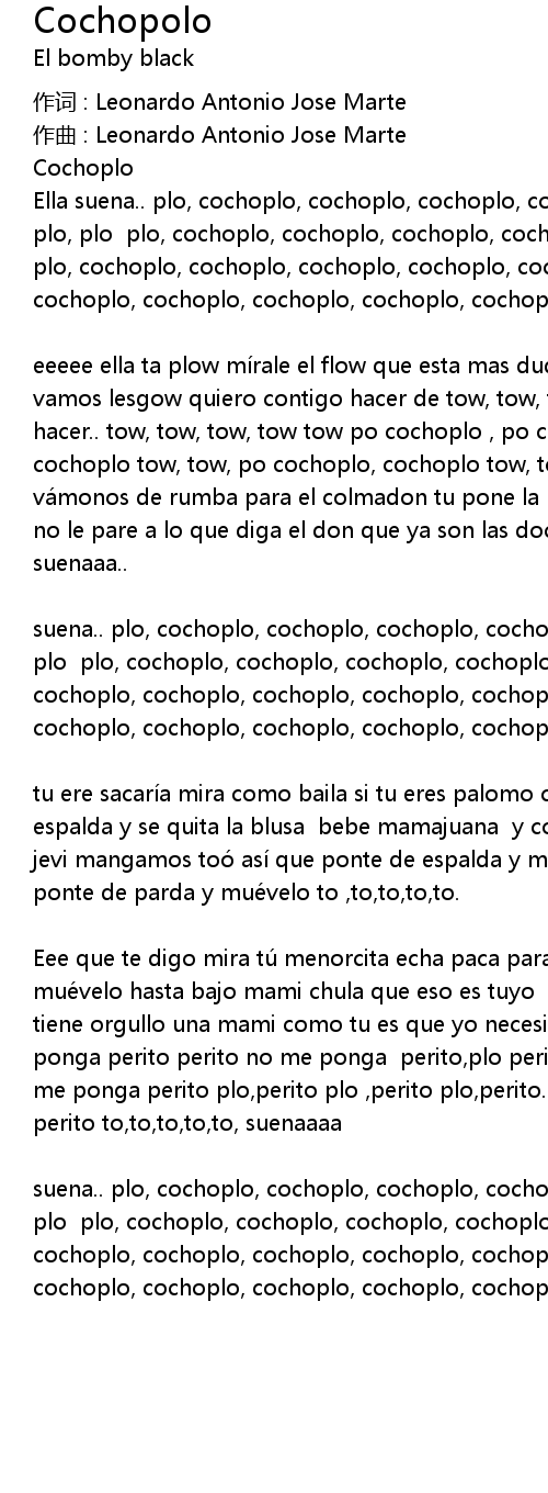 | eeeee ella ta plow mí rale el flow que esta mas dudura que un blow Dale con tow vamos lesgow quiero contigo hacer de tow, tow, tow, tow tow , quiero contigo hacer.. tow, tow, tow, tow tow po cochoplo , po cochoplo, tow, tow po cochoplo , cochoplo tow, tow, po cochoplo, cochoplo tow, tow, cochoplo, cochoplo tow, tow y vá monos de rumba para el colmadon tu pone la le a y yo pongo el fogó n dale y no le pare a lo que diga el don que ya son las doces y cé bale to, to, to, to, to, to suenaaa.. | |