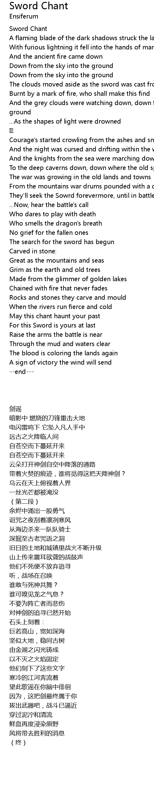 | [02:12.70] | They'll seek the Sowrd forevermore, until in battle they'll fall |