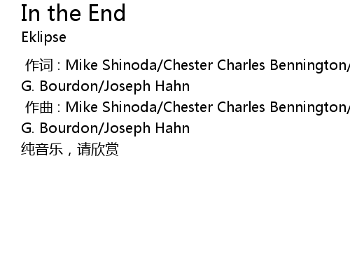| [00:01.000] | zuo qu : Mike Shinoda Chester Charles Bennington Brad Delson Robert G. Bourdon Joseph Hahn |