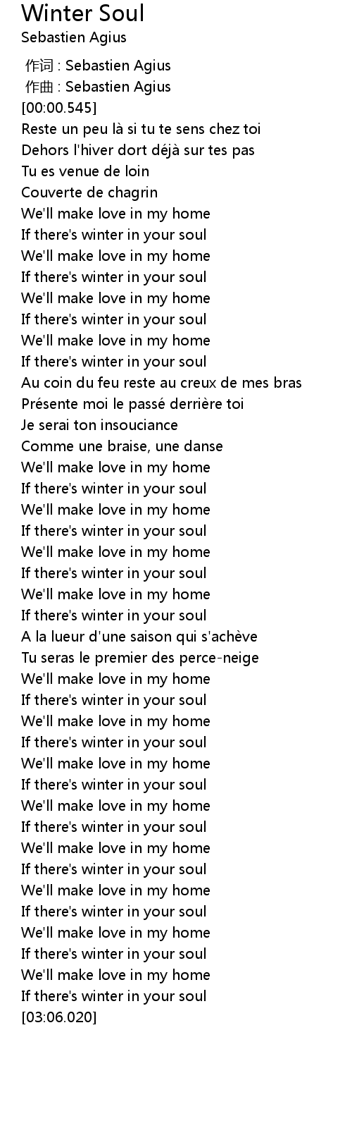 | [00:11.828] | Dehors l' hiver dort de ja sur tes pas |