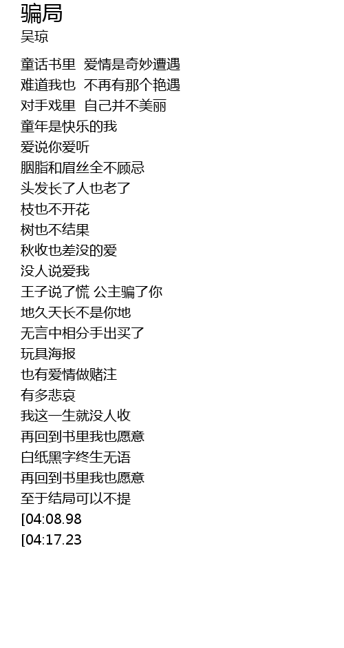 | [01:53.99] | wáng zǐ shuō le huāng gōng zhǔ piàn le nǐ |