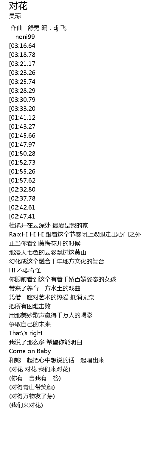 | [01:16.67][02:37.78][02:56.97] | 郎对花姐对花 对到了天之涯 |