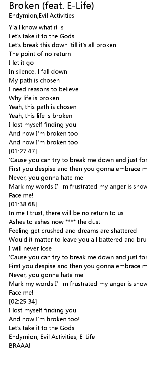 | [00:17.64] | Let's break this down 'till it's all broken |