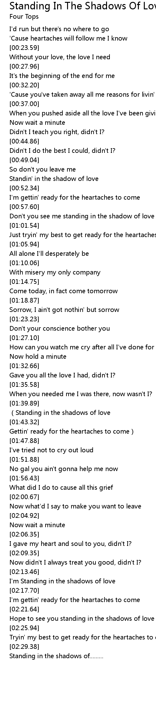 | [01:41.52] | Standing in the shadows of love |