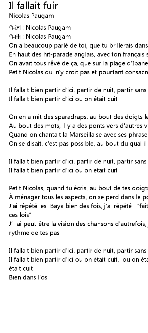 | Il fallait bien partir d' ici, partir de nuit, partir sans bruit | |