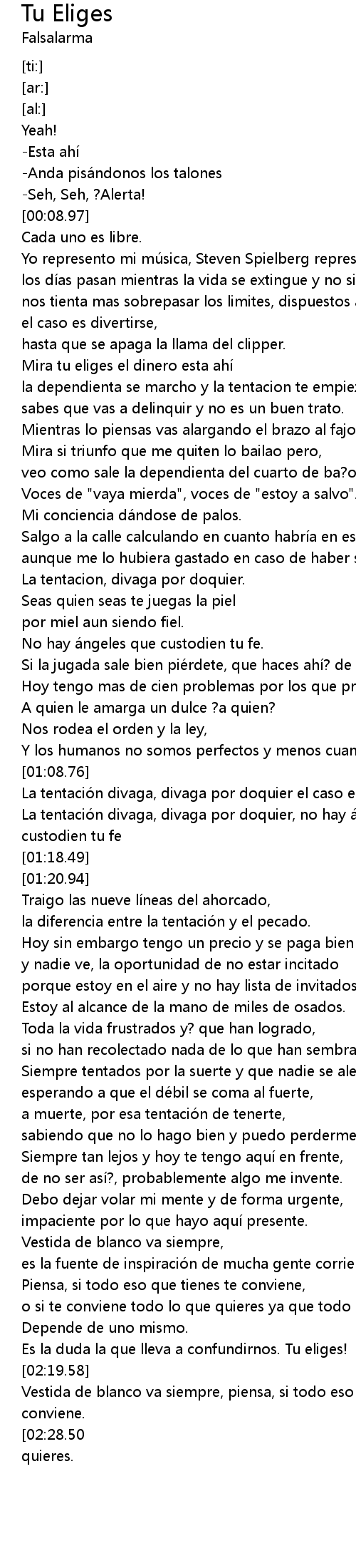 | [02:22.60] | Vestida de blanco va siempre, piensa, si todo eso que tienes te conviene. |