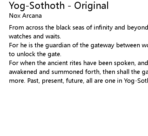 | For when the ancient rites have been spoken, and the Lords of Darkness have been awakened and summoned forth, then shall the gateway between the stars open once more. Past, present, future, all are one in Yog-Sothoth. |