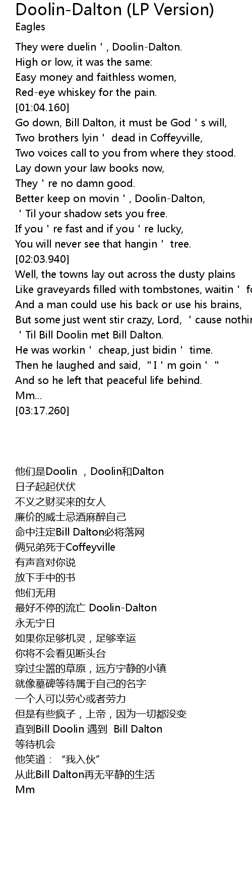 | [00:32.110] | They were duelin, DoolinDalton. |