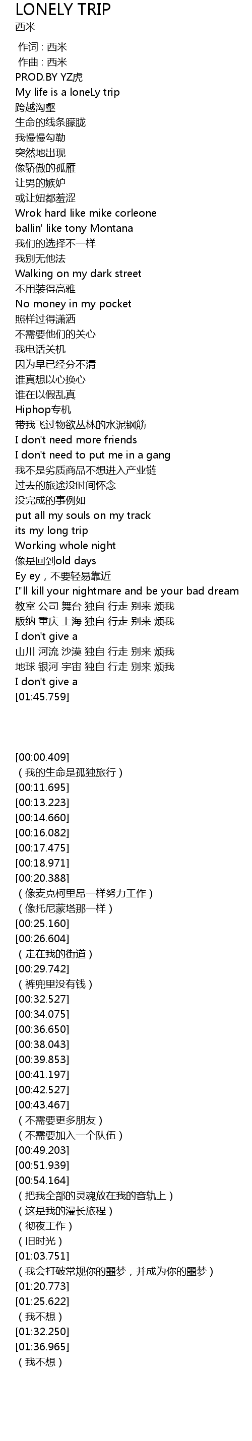 | [01:25.622] | 版纳 重庆 上海 独自 行走 别来 烦我 |