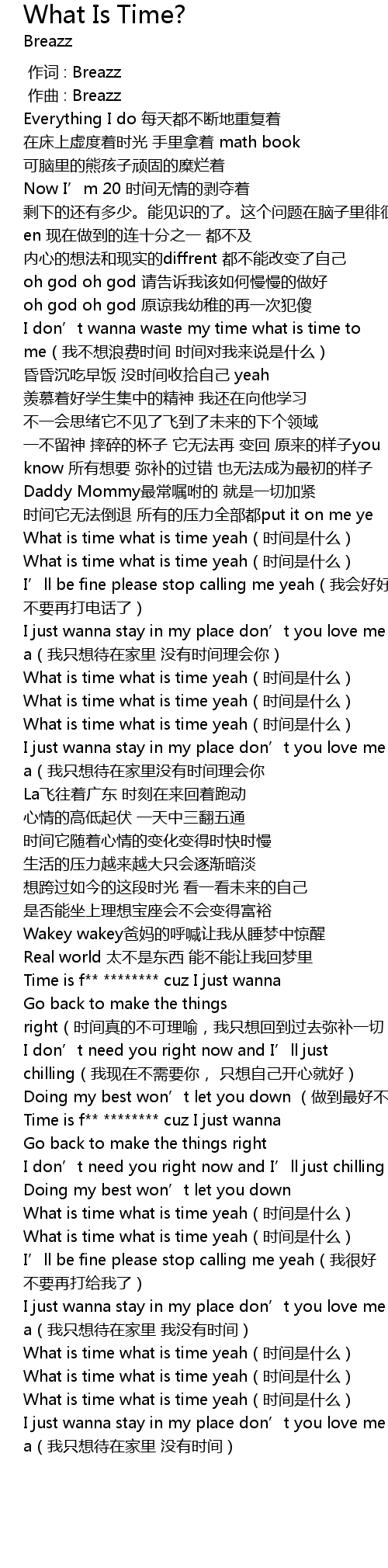 | [01:30.786] | What is time what is time yeah shí jiān shì shén me |