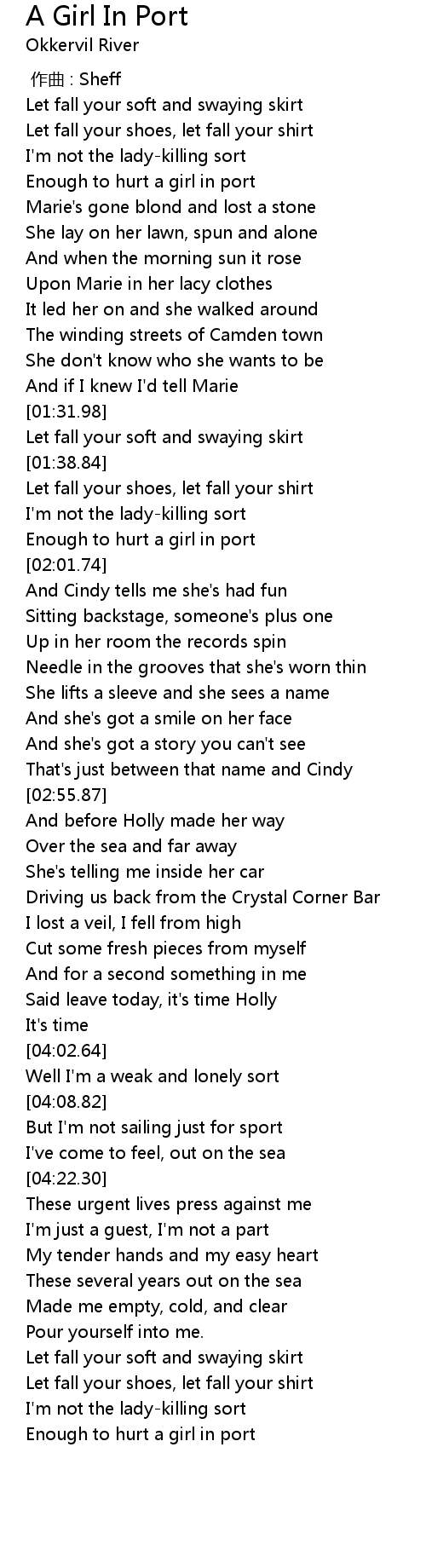 | [05:16.91] | Enough to hurt a girl in port |