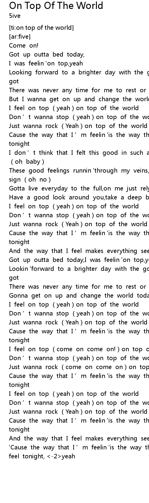 | [02:20.14] | I feel on top (yeah)on top of the world |