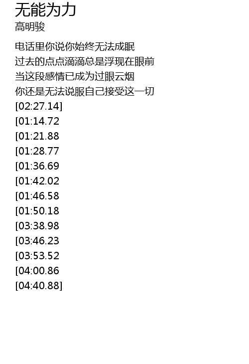 | [04:08.17][03:38.98][01:56.66] | 对于你的心情 我真的无能为力 |