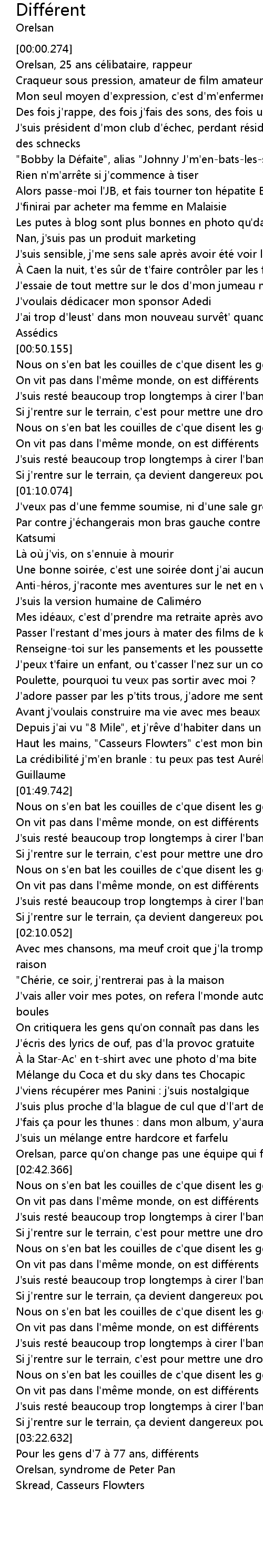 | [00:09.852] | Orelsan, 25 ans cé libataire, rappeur |