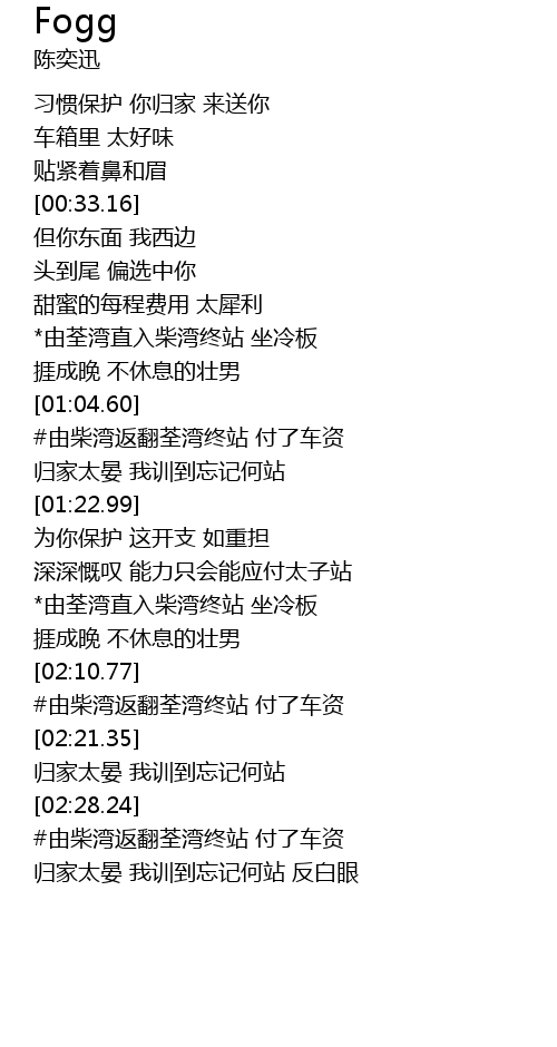 | [02:12.78] | #由柴湾返翻荃湾终站 付了车资 |