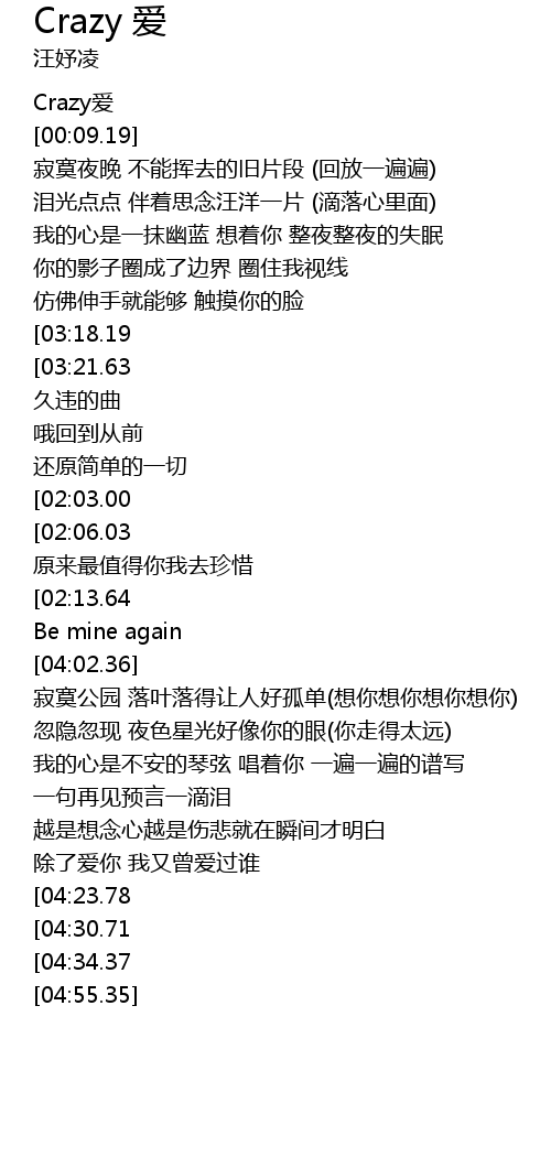 | [03:32.04][03:18.19][01:53.71] | Crazy night crazy love I' m so lonely |