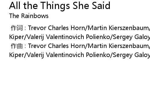 | [00:00.000] | 作词 : Trevor Charles Horn/Martin Kierszenbaum/Elena Vladimirovna Kiper/Valerij Valentinovich Polienko/Sergey Galoyan/Ivan Nikolaevich Shapovalov |