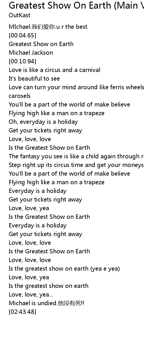 | [02:24.27] | Is the greatest show on earth yea e yea |