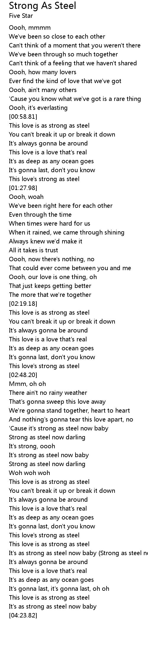 'Cause it's strong as steel now baby |