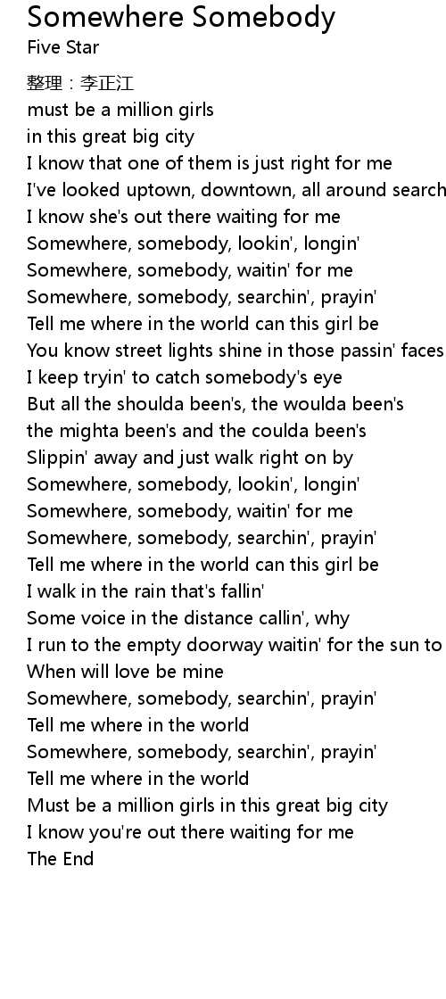 | [01:09.86] | Somewhere, somebody, lookin', longin' |