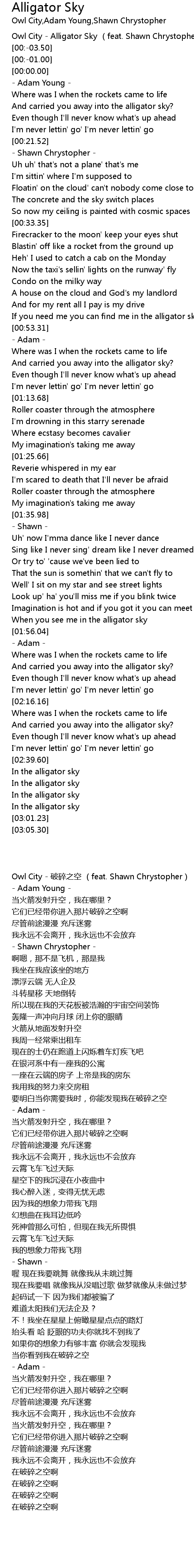 | [00:-04.00] | Owl City - Alligator Sky (feat. Shawn Chrystopher) |