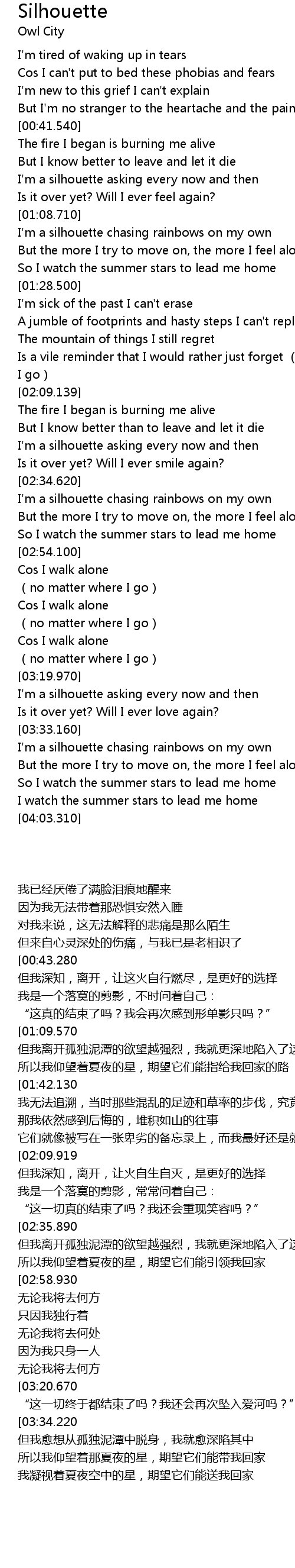 | [02:35.890] | I' m a silhouette chasing rainbows on my own |