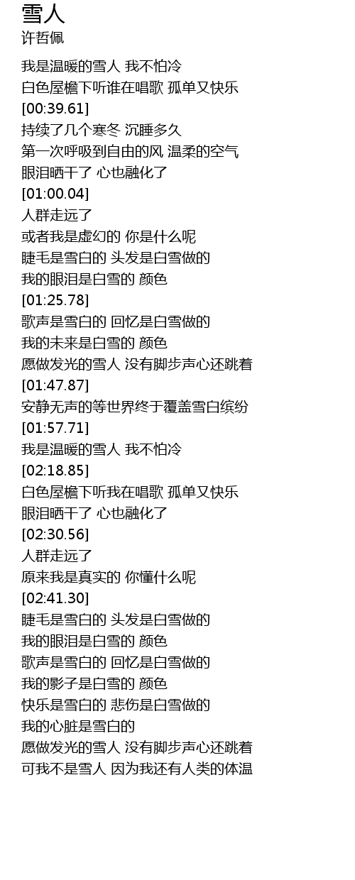 | [03:36.19] | 可我不是雪人 因为我还有人类的体温 |