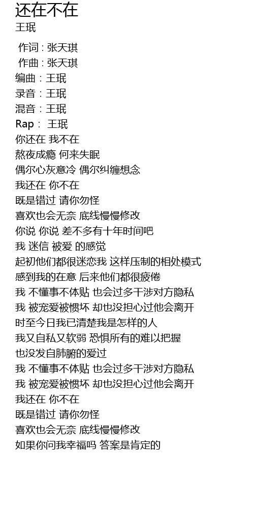 | [01:13.837] | wǒ hái zài nǐ bù zài |