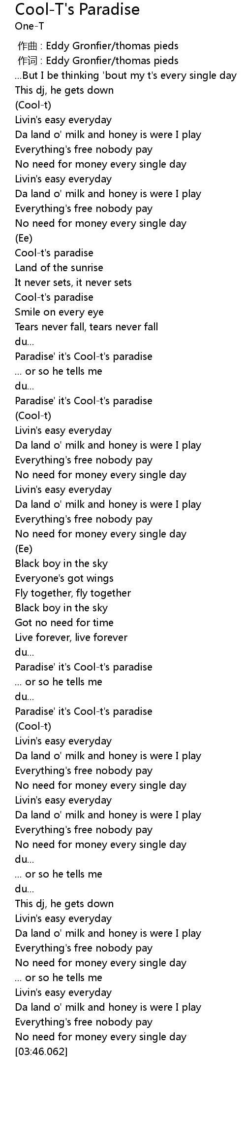 | [01:15.109] | Paradise' it's Cool-t's paradise |