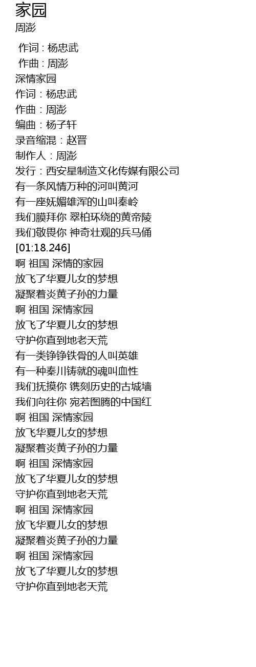 | [01:23.766] | 啊 祖国 深情的家园 |