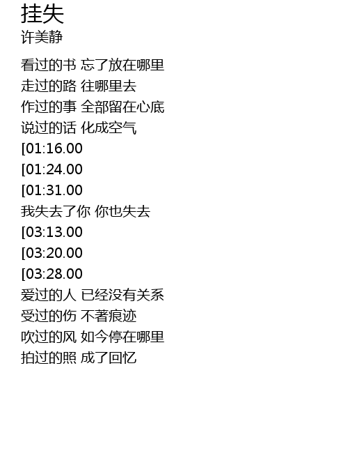 | [03:03.00][01:31.00] | 流到哪里 我失去了你 你也失去 |