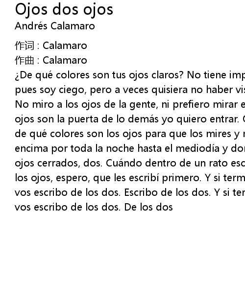| De qué colores son tus ojos claros? No tiene importancia pero quiero saberlo pues soy ciego, pero a veces quisiera no haber visto nunca tus ojos, dos ojos. No miro a los ojos de la gente, ni prefiero mirar el alma pero mi alma si tus ojos son la puerta de lo demá s yo quiero entrar. Quiero mirar, quiero preguntar de qué colores son los ojos para que los mires y no les quite la vista de encima por toda la noche hasta el mediodí a y dormir la siesta muy cerca de tus ojos cerrados, dos. Cuá ndo dentro de un rato escriba de tus besos se acordaran los ojos, espero, que les escribí primero. Y si terminó escribiendo que toda vos escribo de los dos. Escribo de los dos. Y si terminó escribiendo que toda vos escribo de los dos. De los dos |